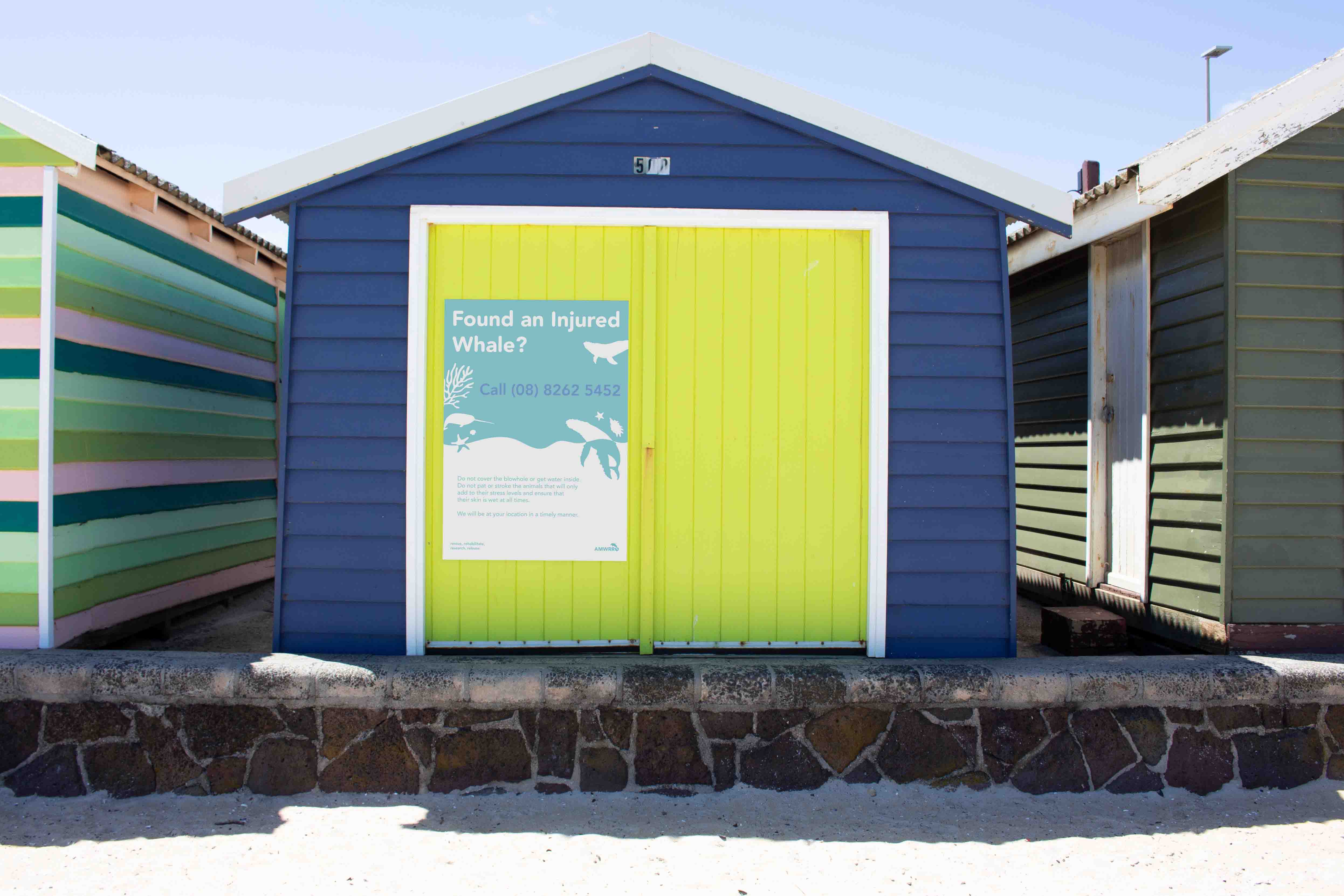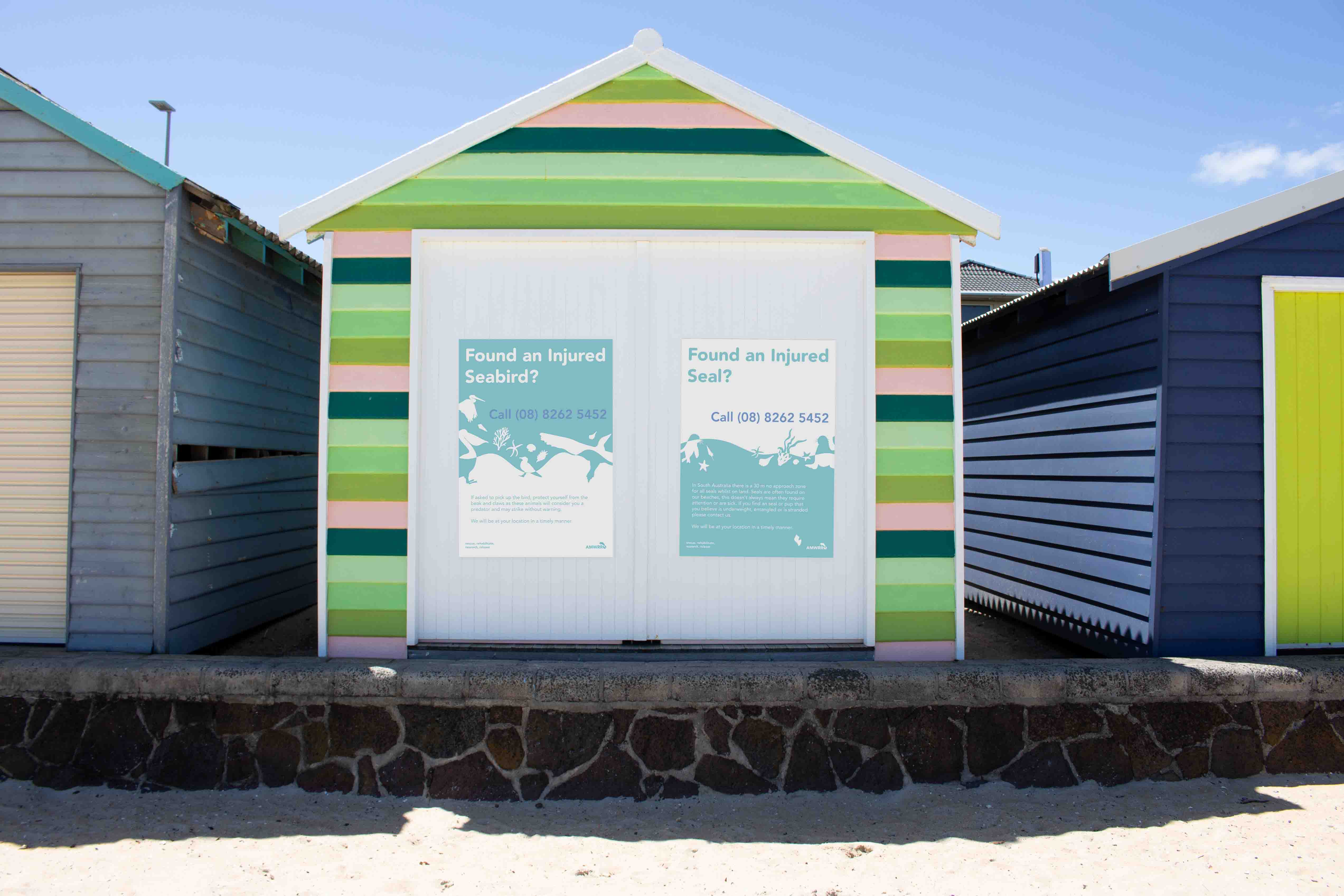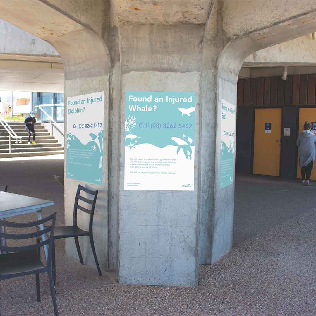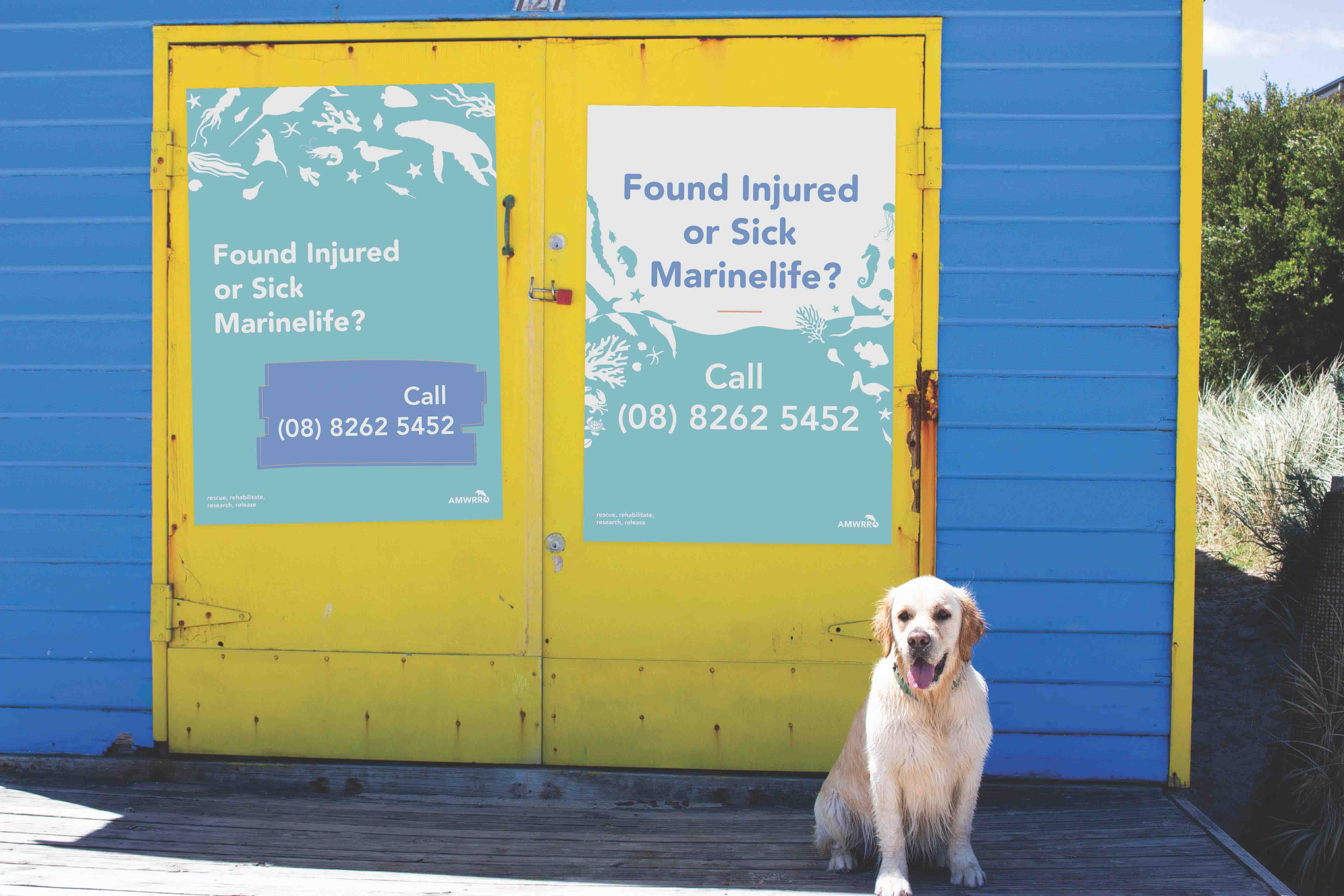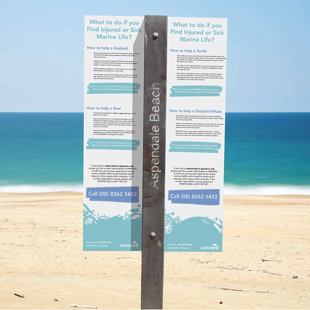 The main way in which AMWRRO communicates with the general public is through those who get in contact with them about possibly injured or sick marine life that need help. In order to allow the public to learn about the existence of AMWRRO and therefore better the help the native fauna, a poster campaign could be implemented that are placed across a series of beaches to make it easier for the organisation to rescue and rehabilitate wildlife. The locations in which these posters could be placed include lifesaving clubs, beach houses and bins as these are commonly found at beaches and can be easily seen. The series of posters created includetwo different types; general posters that act as call to action for those who come into contact with any type of marine life and also specific marine animal posters that provide information about how to care for a variety of species of marine fauna. This deliverable compliments the rebrand of AMWRRO in that it makes the organisation more accessible and friendly, whilst engaging a larger amount of the general public.