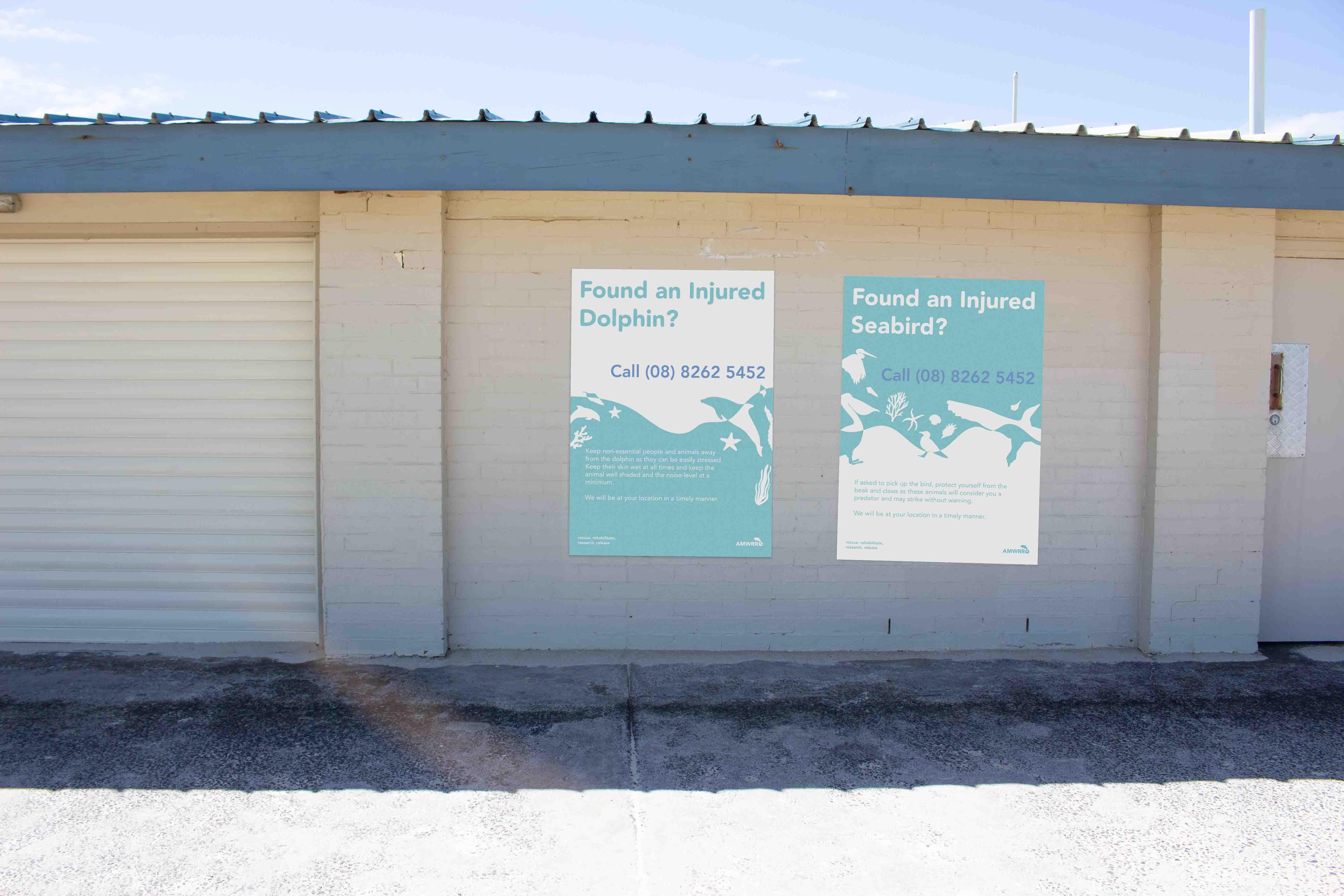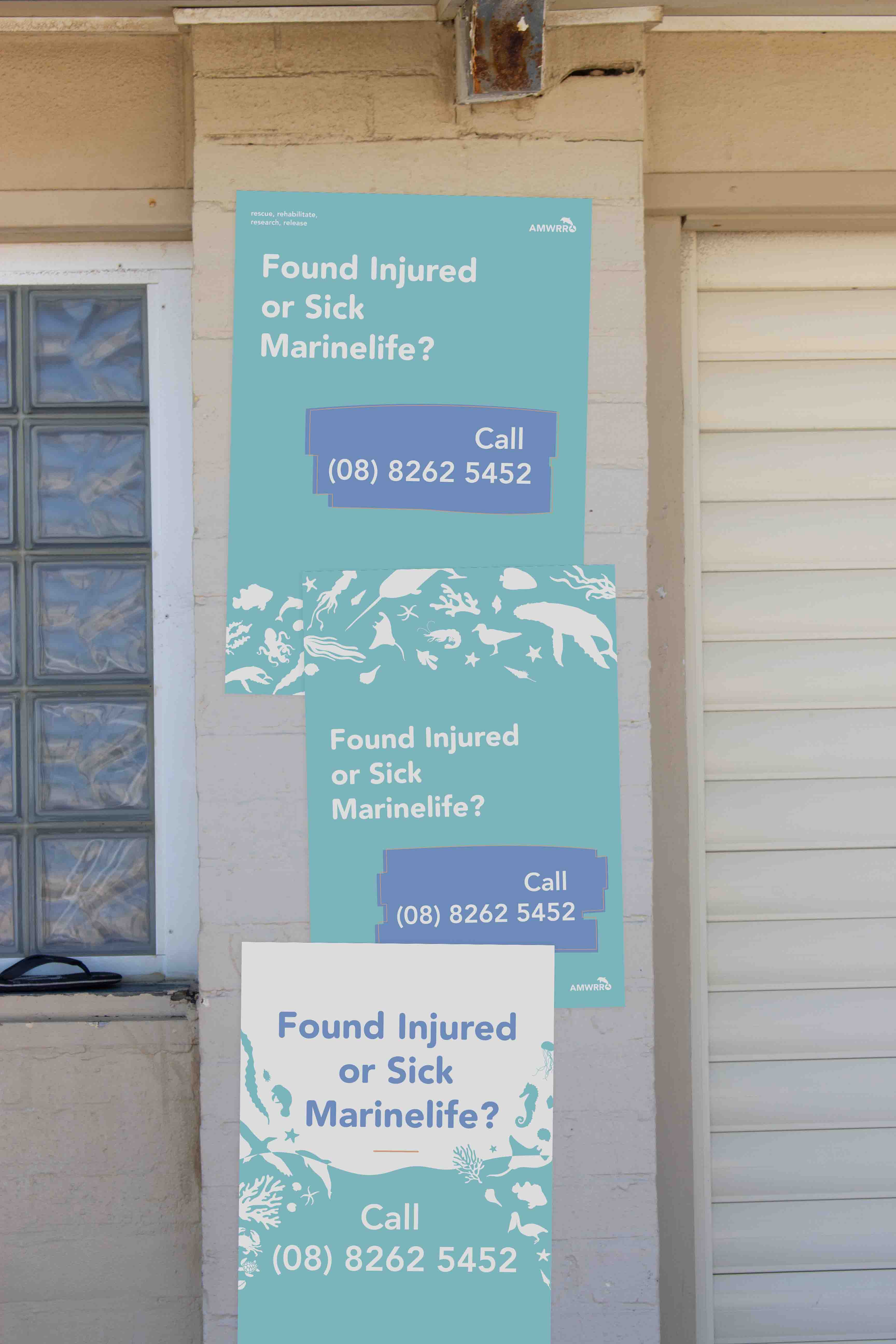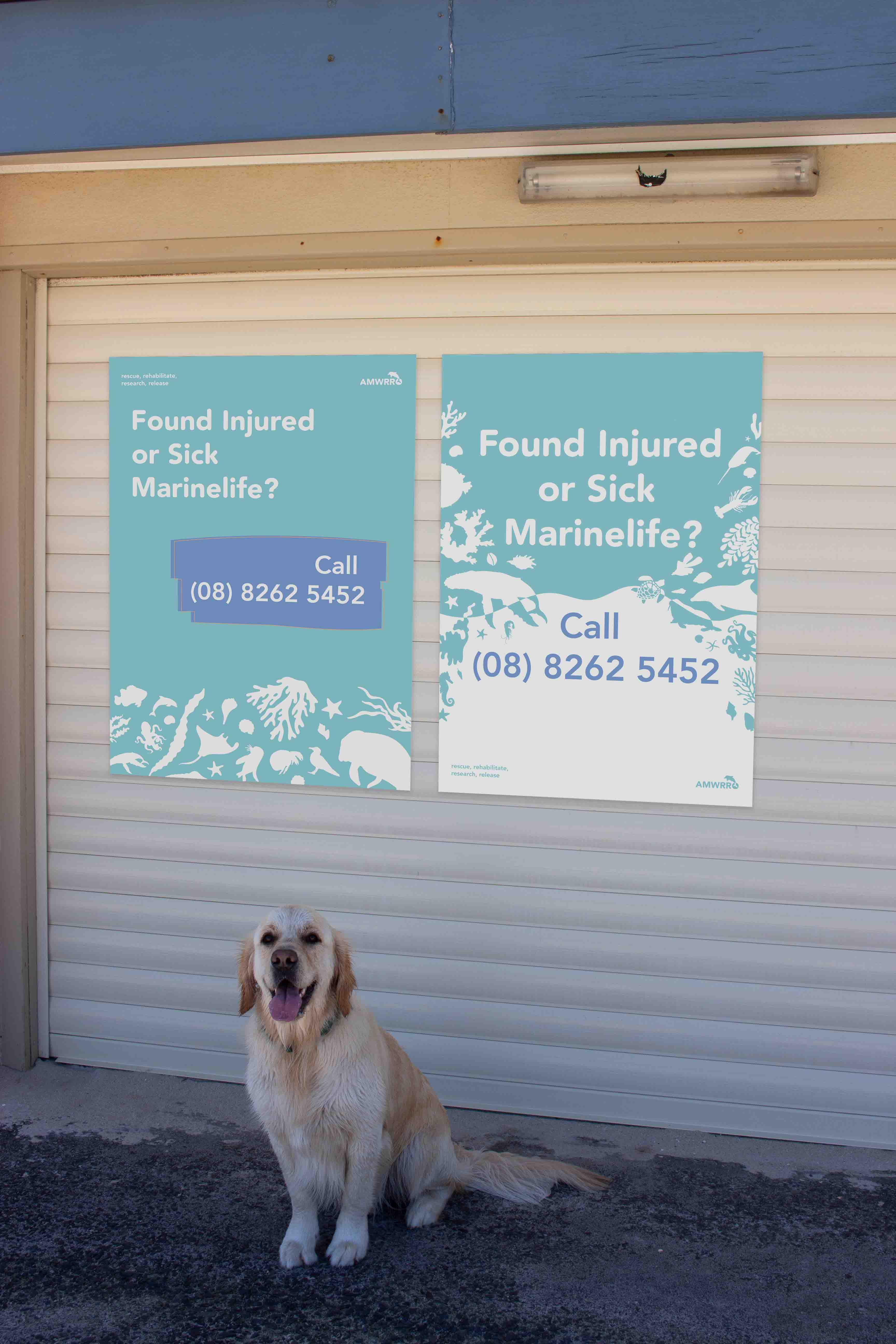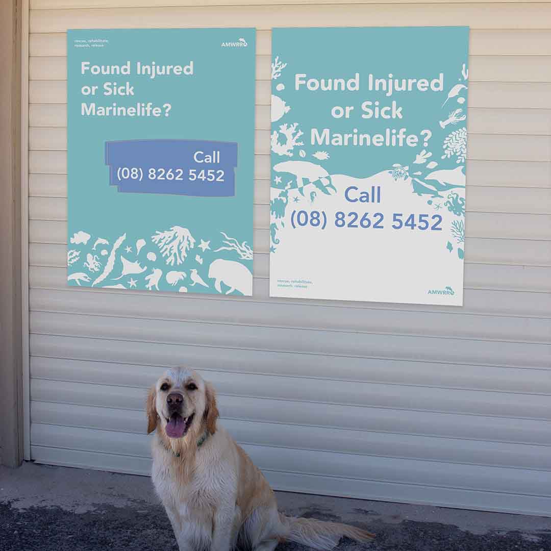 The main way in which AMWRRO communicates with the general public is through those who get in contact with them about possibly injured or sick marine life that need help. In order to allow the public to learn about the existence of AMWRRO and therefore better the help the native fauna, a poster campaign could be implemented that are placed across a series of beaches to make it easier for the organisation to rescue and rehabilitate wildlife. The locations in which these posters could be placed include lifesaving clubs, beach houses and bins as these are commonly found at beaches and can be easily seen. The series of posters created includetwo different types; general posters that act as call to action for those who come into contact with any type of marine life and also specific marine animal posters that provide information about how to care for a variety of species of marine fauna. This deliverable compliments the rebrand of AMWRRO in that it makes the organisation more accessible and friendly, whilst engaging a larger amount of the general public.