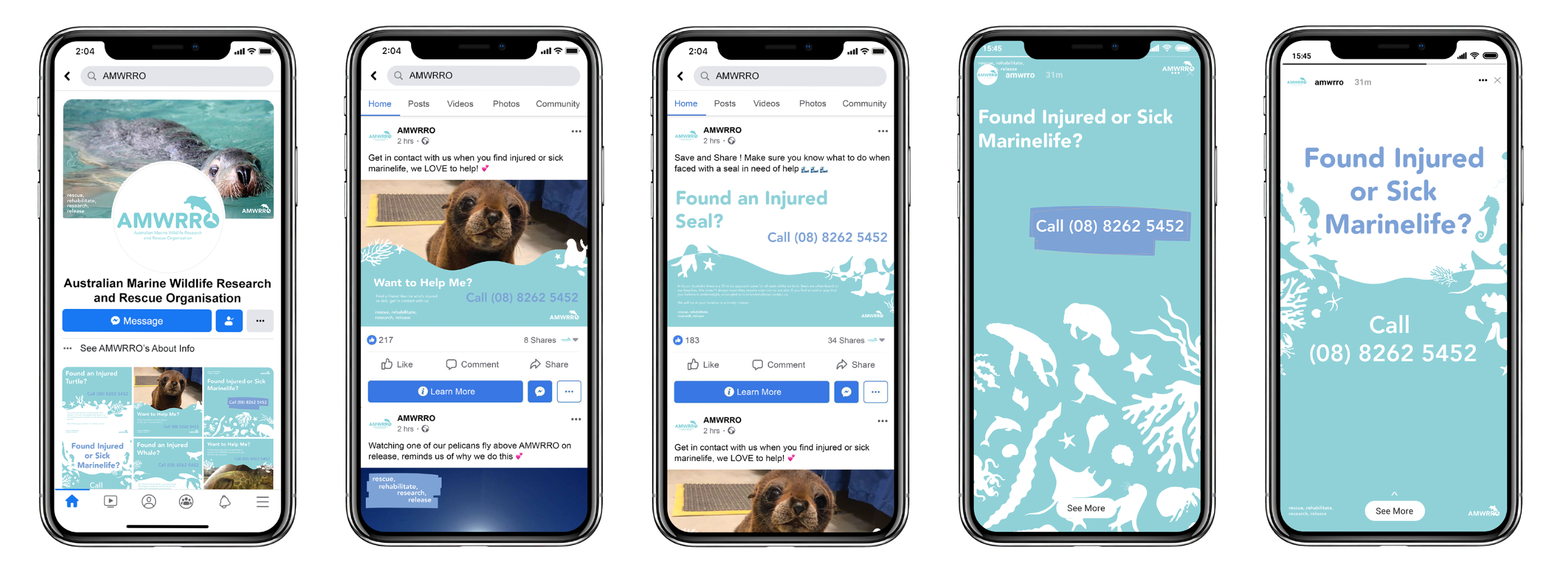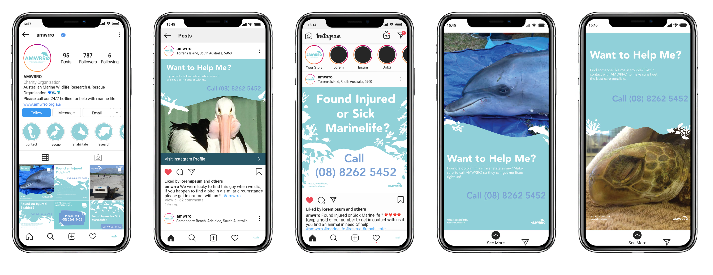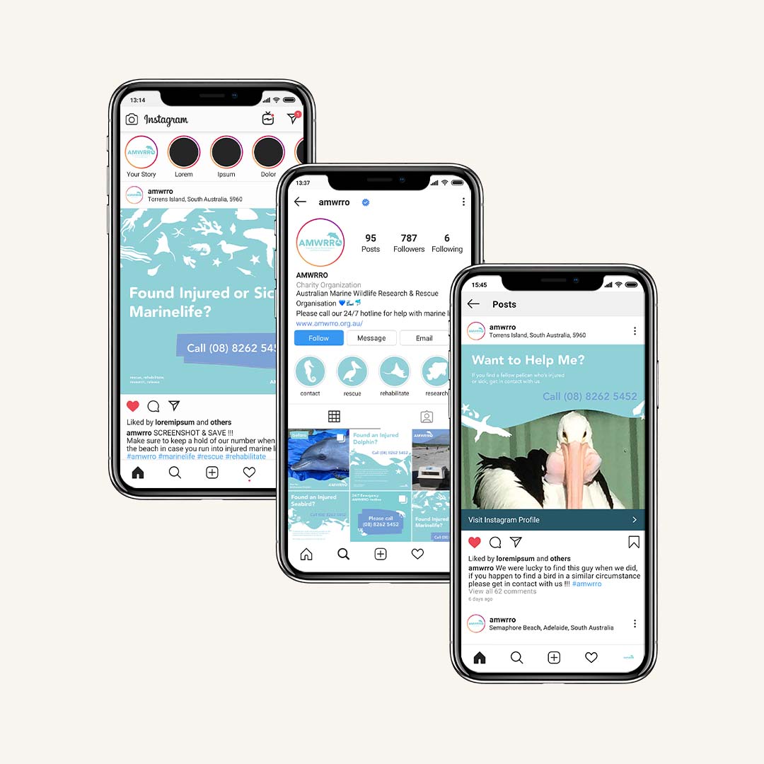 The online campaign for AMWRRO works directly in conjunction with the beach poster campaign in that it uses posts similar to the printed posters. There are three different types of posts that are utilised; general posters that act as call to action for those who come into contact with any type of marine life, specific marine animal posters that provide information about how to care for a variety of species of marine fauna and photos of specific animals saved by AMWRRO to raise awareness on the species they come into contact with. This campaign has the aims of being another way in which individuals become familiar with the organisation and ensure that they know a way in which they can get into contact with them. Mockups sourced from Pixeden.